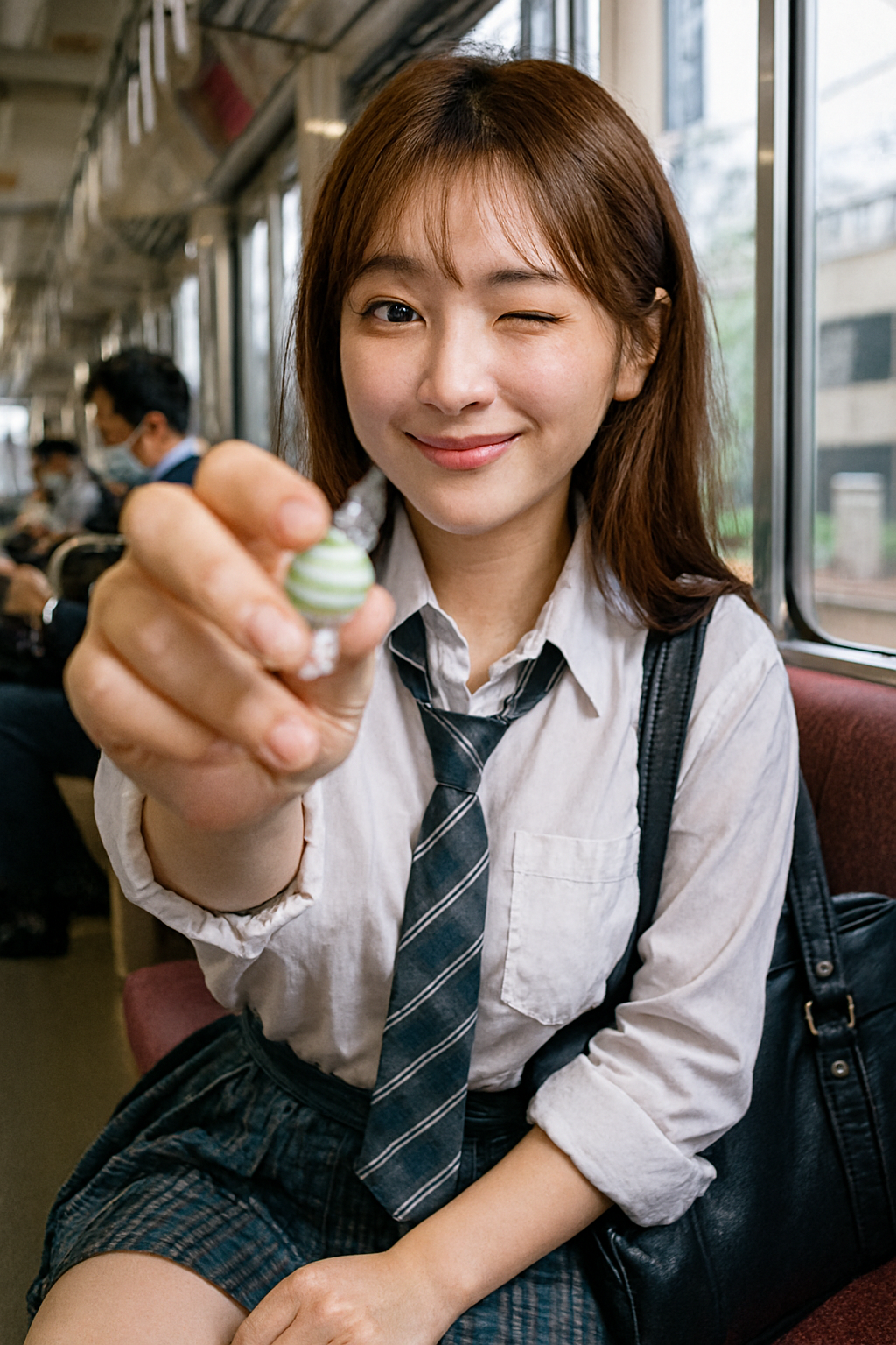 사탕 하나를 내밀며 웃는 여고생이었다.