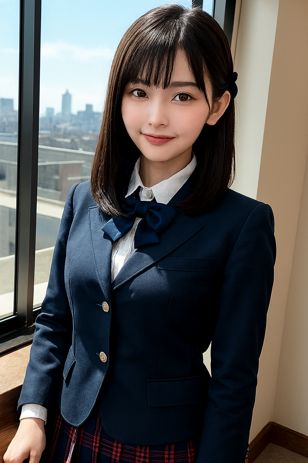 국제적 감각을 중시하는 학교로, 교복은 네이비 블레이저와 체크 스커트, 와인색 리본으로 세련된 유럽풍 느낌을 줍니다. 가격은 약 8만~10만 엔이며, 학교 지정 업체에서만 구매 가능합니다.