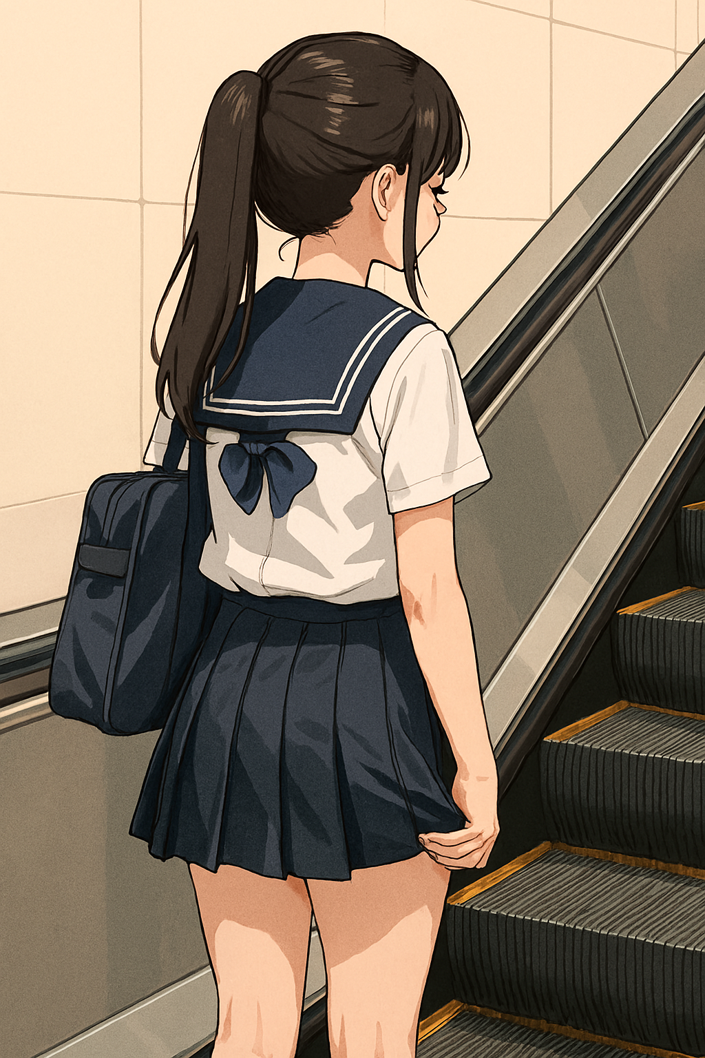 에스컬레이터에서 짧은 치마를 손으로 살짝 누르는 여고생의 모습.