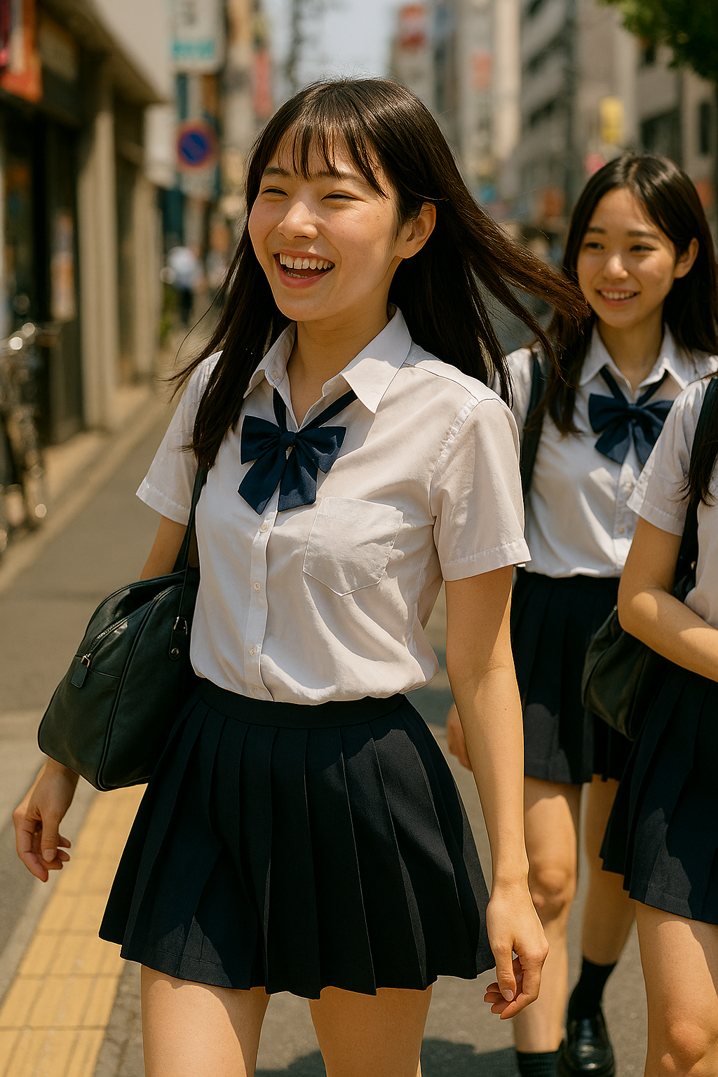 한 일본 여고생이 친구들과 웃으며 걸어가고 있었다.